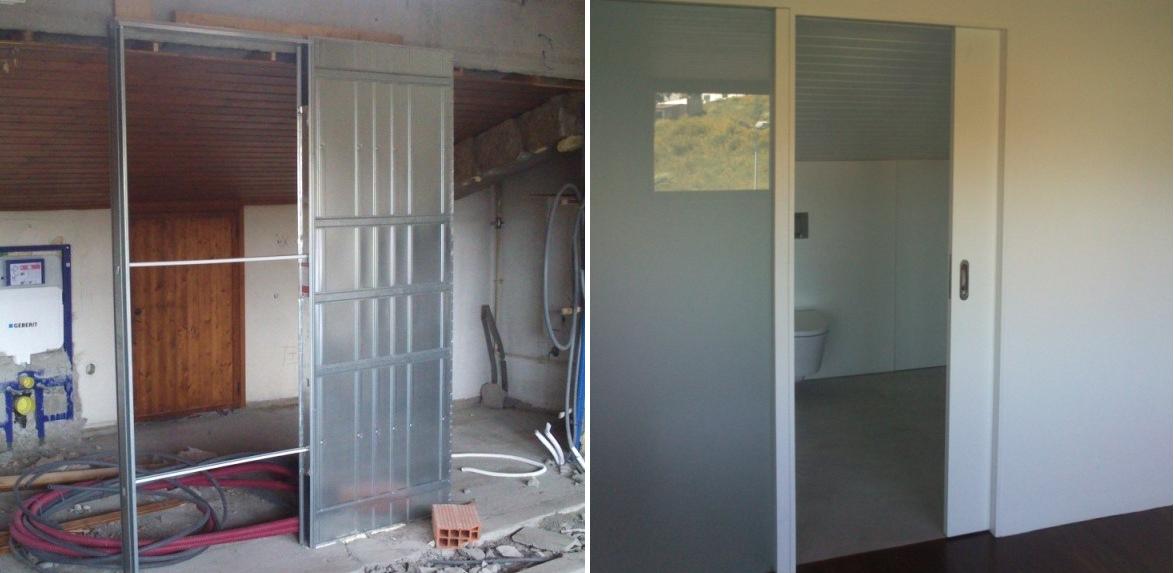 Na imagem podemos ver a fase de montagem de uma porta de correr embutida e o seu aspeto depois de concluída a obra.